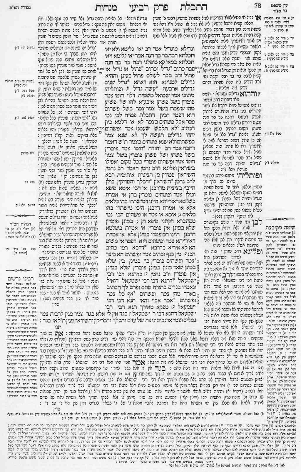 A különféle ételáldozatok törvényei. Ebben a traktátusban kerülnek megtárgyalásra a cicit, a szemlélőrojtokra, és a töfilin, az imaszíjakra vonatkozó törvények. Ennek a traktátusnak a terjedelme a Babilóniai Talmudban 110 lap.